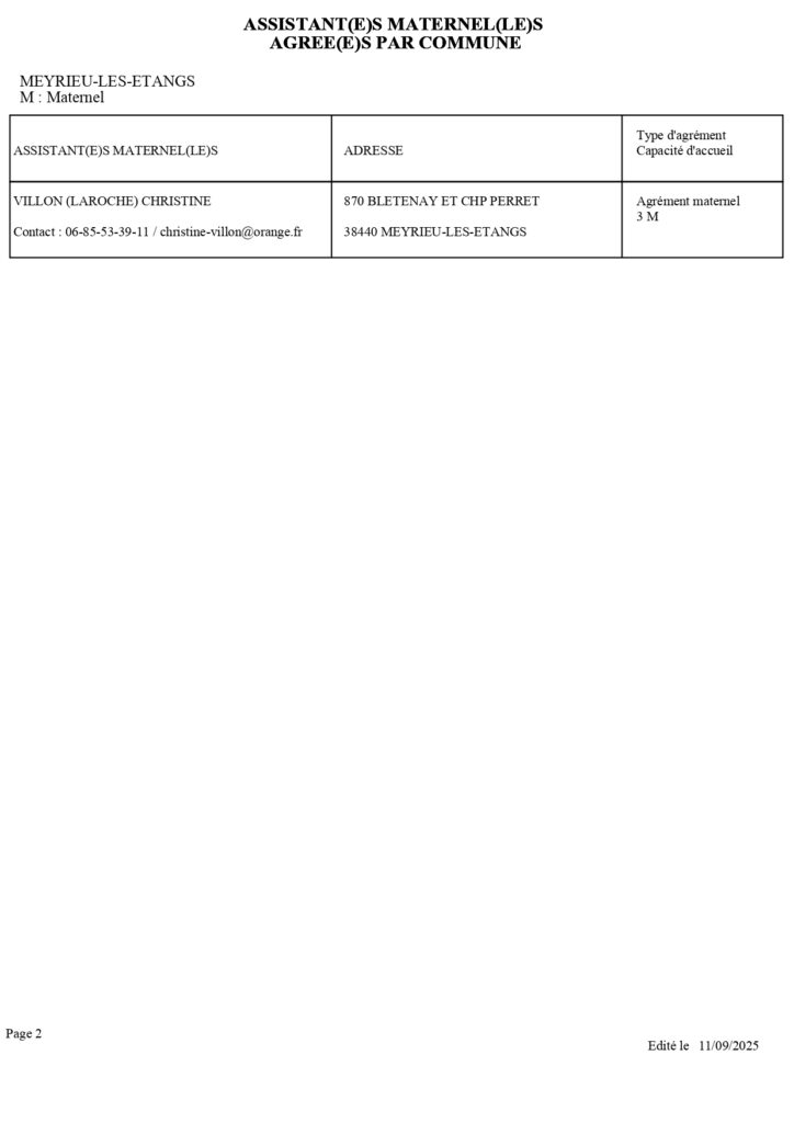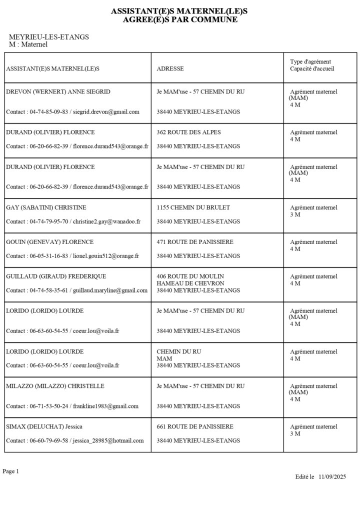 Vous trouverez ci dessous la liste des assistantes maternelles sur la commune agrées par le département de l’Isère. Le site Mon enfant.fr est également disponible pour une recherche d’un mode de garde.